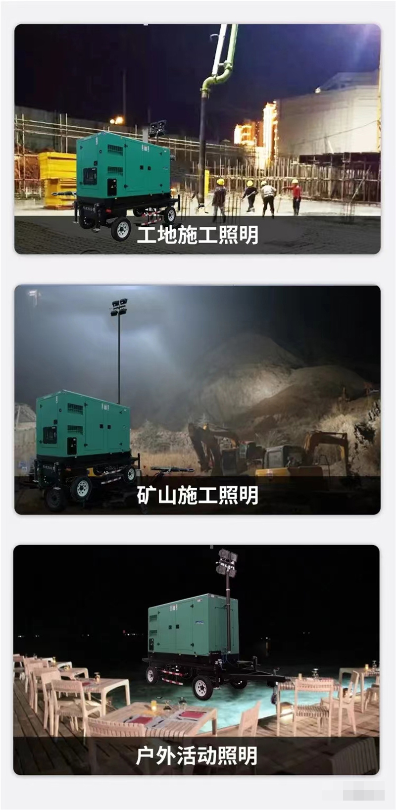 各種夜間作業(yè)如大型施工、工程搶修、災(zāi)情搶險(xiǎn)、消防照明、警案現(xiàn)場(chǎng)、交通拯救、事故處理和廣告拍攝等場(chǎng)合,滿足了現(xiàn)場(chǎng)對(duì)大面積、高亮度照明的需求。